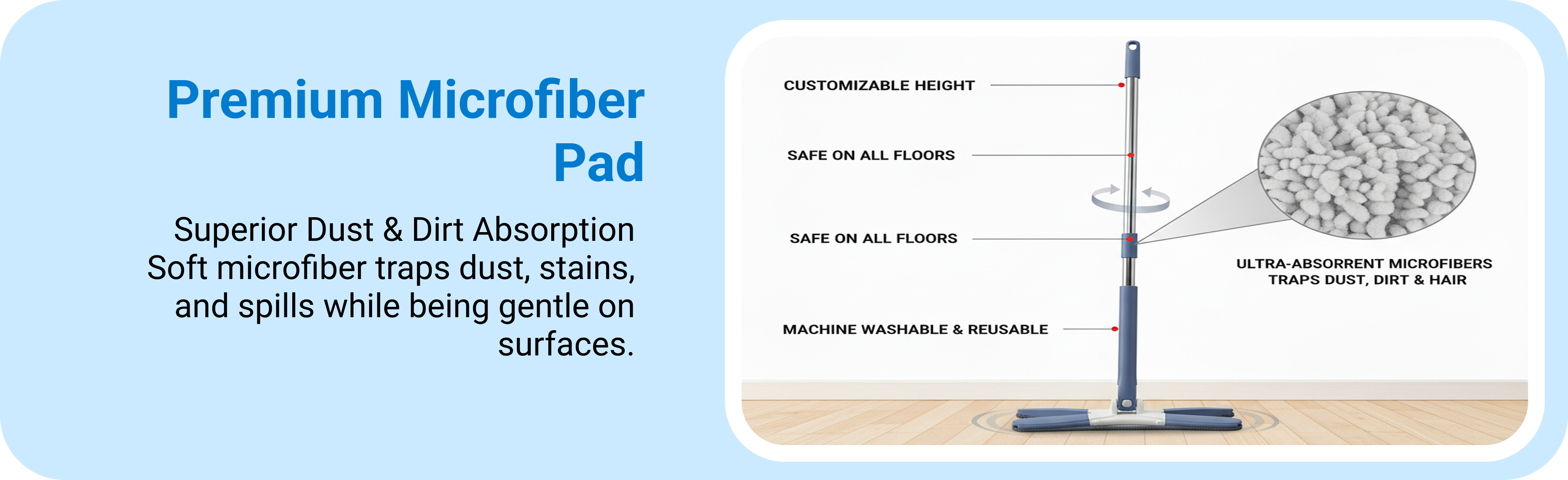 Premium Microfiber Cloth With thousands of microfibers to absorb the smallest particles of dirt and dust. Microfiber mop tip, floor safe, suitable for tile/wood/hardwood/laminate/concrete/stone etc.