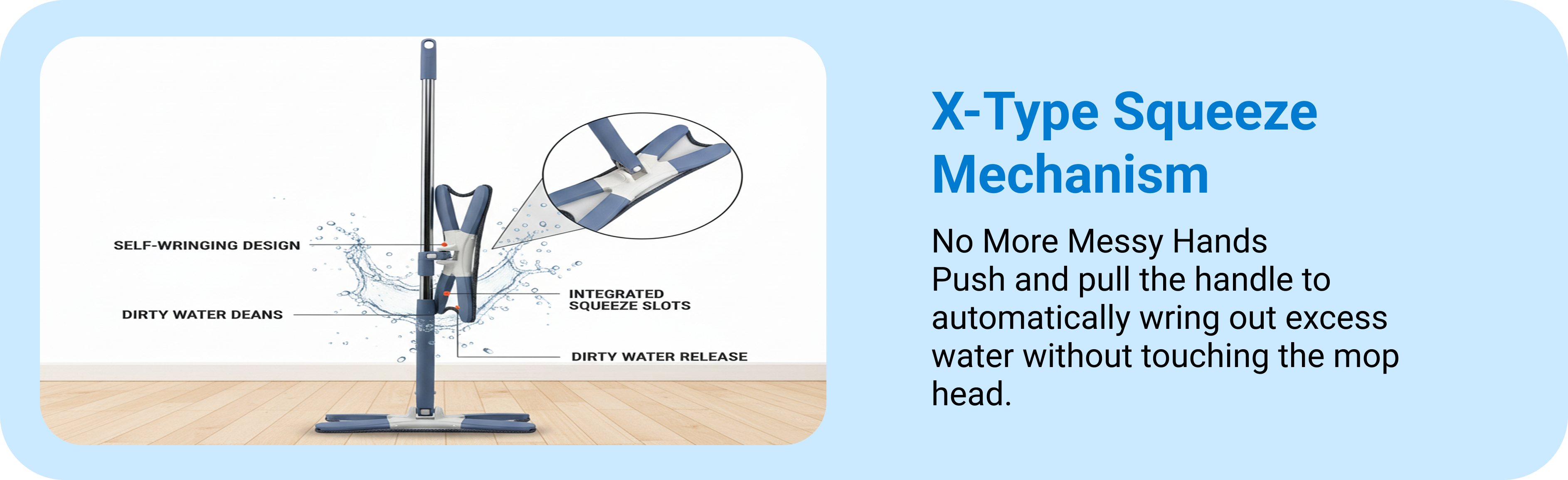 Compression Function X Type Easy Pressure Flat Mop Simply push and pull it gently to achieve a hand-like twisting effect to dry the water on the cloth of the mop.
